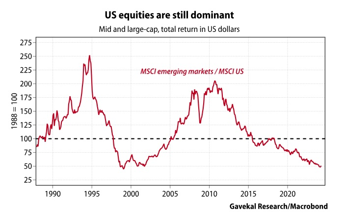Abaixo temos o gráfico, em dólares, ilustrando a relação entre o valor da carteira MSCI Mercados Emergentes e o valor da carteira MSCI EUA. Ao contrário do que muitos pensam, o ápice nos últimos 35 anos não foi visto durante a década subsequente à entrada da China na Organização Mundial do Comércio (2001).